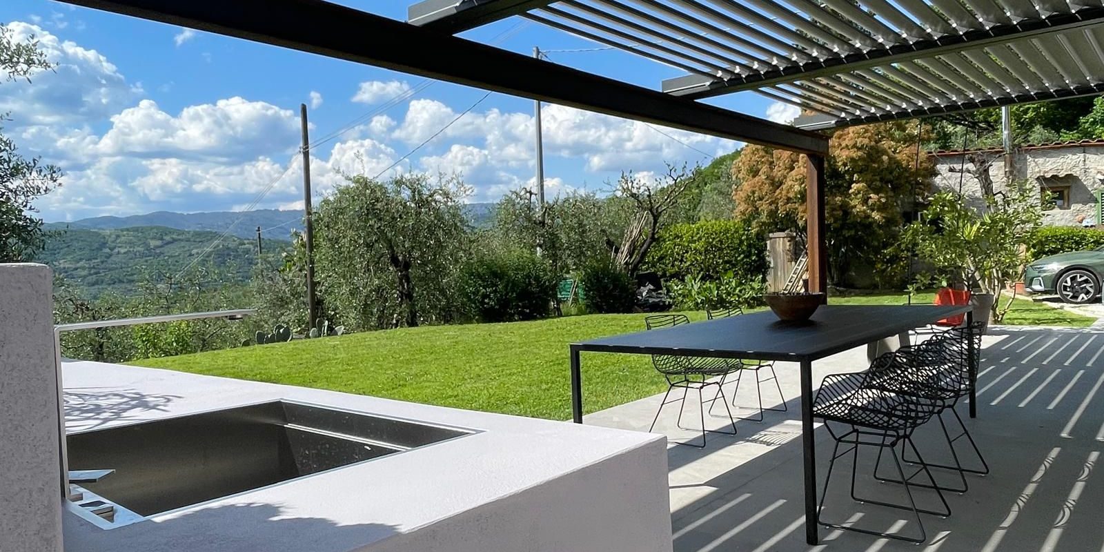 Le soluzioni migliori prevedono strutture progettate su misura, senza viti a vista, con canalizzazione dell’acqua interna e predisposizione per cavi, illuminazione LED, schermature verticali e chiusure in vetro. Questo è un aspetto decisivo perché una pergola di fascia alta non nasce come elemento isolato: deve poter dialogare con l’architettura e con l’uso reale dello spazio, che sia esso un giardino privato oppure un dehors per ristoranti, hotel e strutture aperte al pubblico.